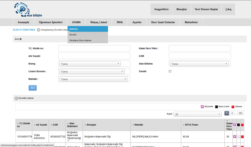 Bir çok İlçe Milli eğitim kurumlarının kullandıgı , üçretlik öğretmenlik ve Norm fazlası yönetim sistemi ,Program hem üçretli öğretmenlik yapmak isteyenleri brans olarak dogru yönlendirmesi ve sisteme web üzerinden basvuru sağlanması bilgilerinin depolanması , ikamet ettiği yere en yakın olan okulların yönlendirlmesi için hazırlanmıstır ,
